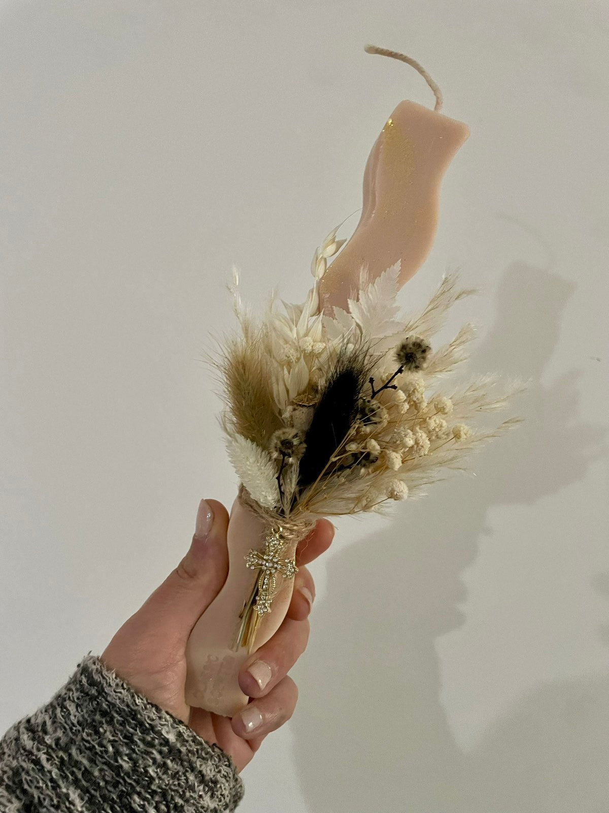 Χειροποίητη λαμπάδα απο φυτικό κερί ελαιοκράμβης 150 γρ με αποξηραμένα λουλούδια pampas και στάχυ, σε κομψό boho–luxury ύφος.