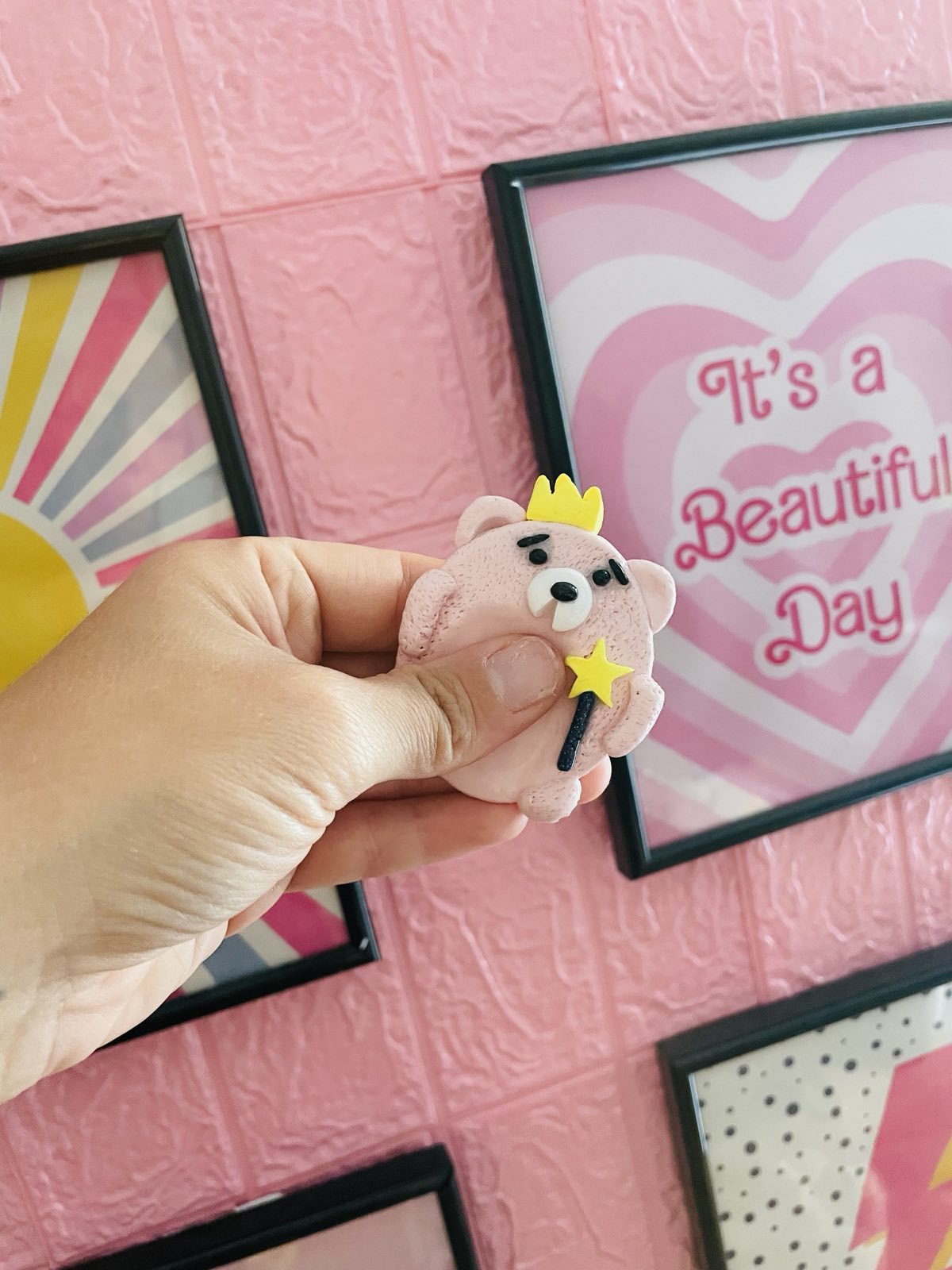 Χειροποίητη από πολυμερικό πηλό, με σχέδιο αρκουδάκι σε ροζ απόχρωση, στέμμα και ραβδί, αυτή η πέτρα είναι ιδανική για να την κρατάς στην παλάμη σου όταν χρειάζεσαι λίγη ηρεμία ή απλά θέλεις να χαμογελάσεις.