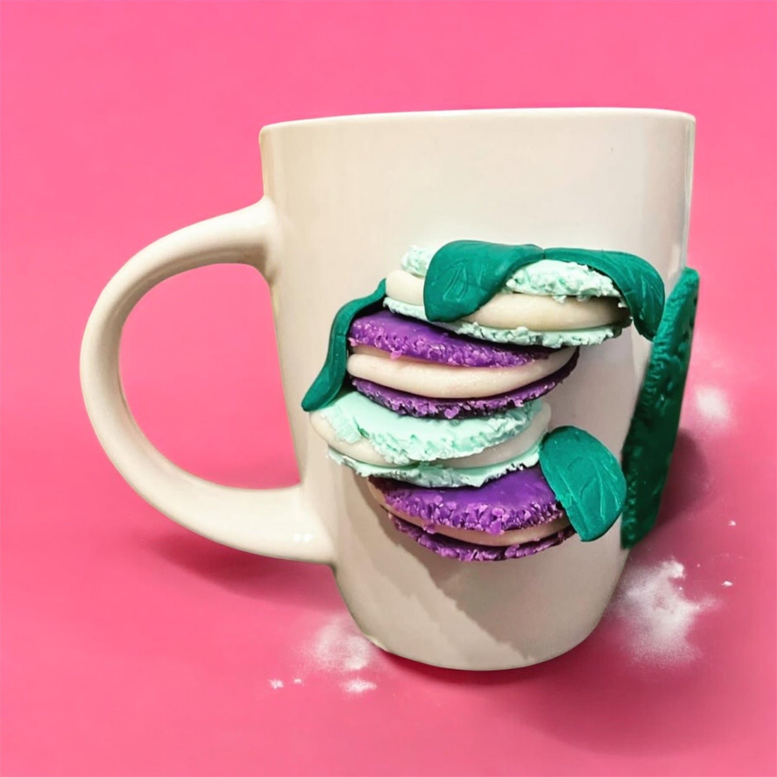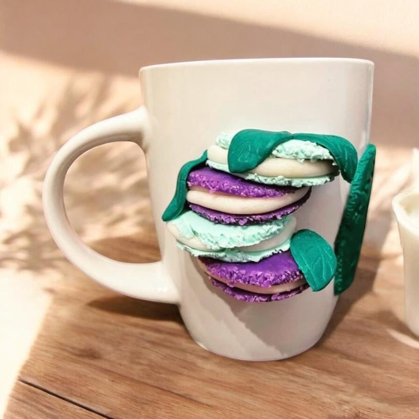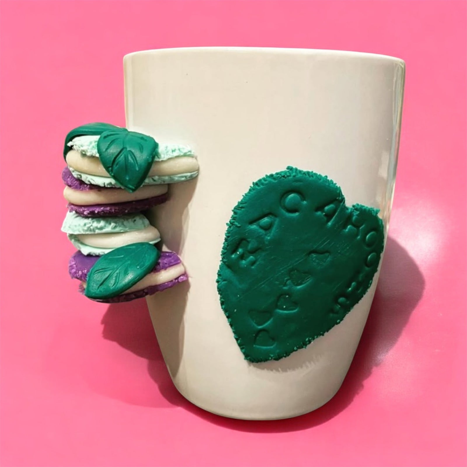 Απόλαυσε το αγαπημένο σου ρόφημα με μια δόση γαλλικής γλυκύτητας! Αυτή η κούπα διαθέτει χειροποίητη φιγούρα μακαρόν από πολυμερικό πηλό, που χαρίζει κομψότητα και παιχνιδιάρικη διάθεση σε κάθε γουλιά. Ιδανική για τους λάτρεις των γλυκών και για όσους αγαπούν τα cute girly αντικείμενα.